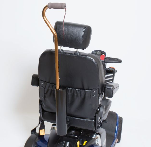 The Pride Cane or Crutch Holder easily stores your cane or crutches. It attaches to the universal holder on the back of most Pride scooter or powerchair seats.