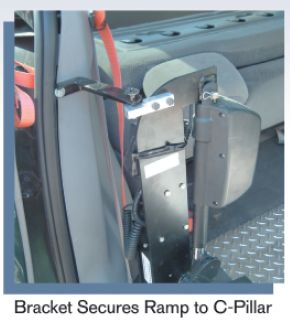 Mount bracket quickly seperates in half for quick ramp removal as needed with quick release pins. Ramp stows upright inside door.