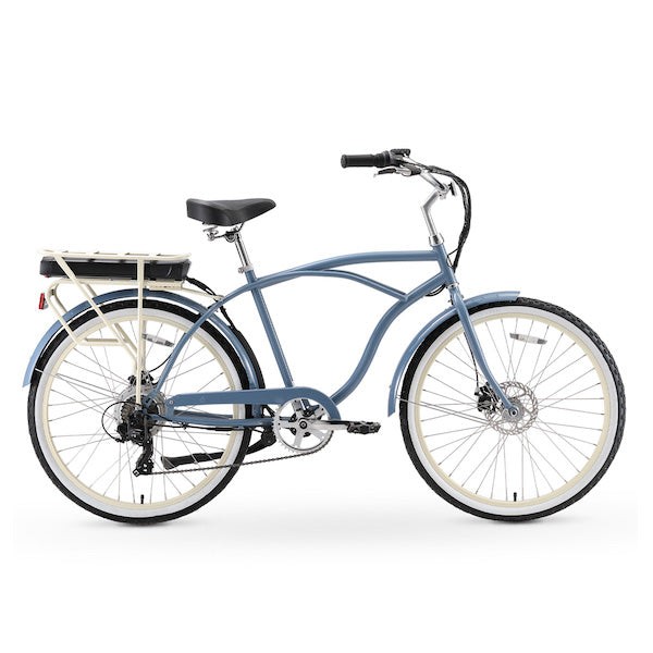 Enjoy cruising with the Around the Block Men's E-Bike, where classic design meets modern power. This electric cruiser features a 500-watt rear hub drive motor, seamlessly integrated into a timeless beach cruiser frame for ultimate comfort and ease. Its sleek design conceals advanced electric components, allowing you to glide through your day with style. Whether tackling hills or coasting on flat terrain, the powerful yet whisper-quiet motor and smooth seven-speed derailleur make each ride feel effortless. With easy-stop disc brakes and concealed wiring, this E-Bike exudes simplicity while delivering an enhanced cycling experience.