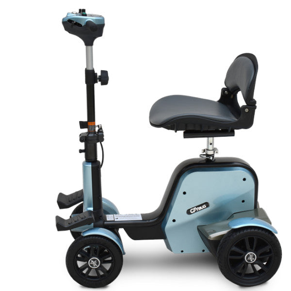 The CityBug is the latest innovation from EV Rider. With a removable seat and folding tiller, the CityBug folds down to just 20(H) x 20(W) x 34(L) inches and weighs in at only 67 pounds. The 12Ah battery can easily be removed for storage or transport and lowers the weight of the CityBug to an easy-to-manage 50 pounds. The CityBug mobility scooter lets you travel up to 8 miles on a single charge. This one-of-a-kind mobility scooter is great for travel and easy to store when not in use thanks to its unique and low-profile design. The CityBug is great for use indoors and outdoors.