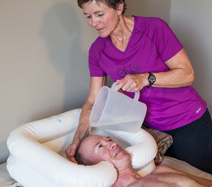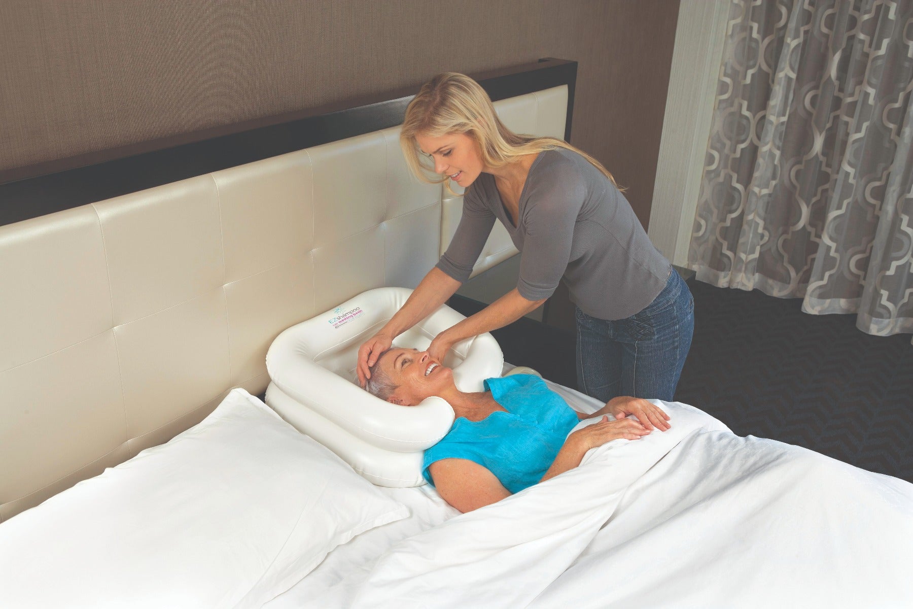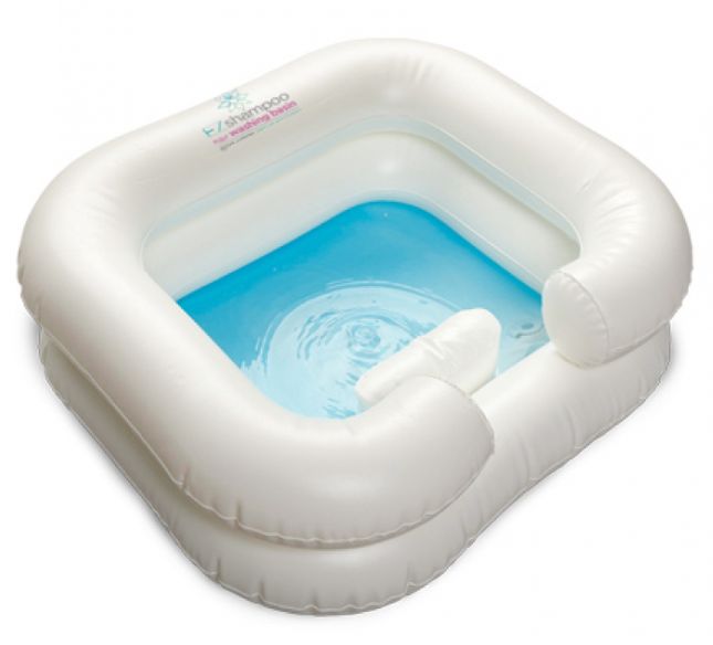 The EZ-SHAMPOO Hair Washing Basin allows for a refreshing, revitalizing shampoo without getting out of the bed. Comfortable and convenient, the inflatable basin provides secure, form-fitting support that cushions the head and shoulders. A caregiver can quickly shampoo and rinse a client's hair without awkward lifting and bending. The EZ-SHAMPOO Hair Washing Basin is made of heavy-duty vinyl is Latex free, and comes with a 1-year limited warranty.