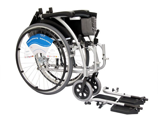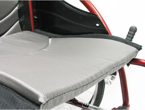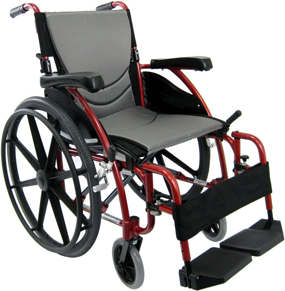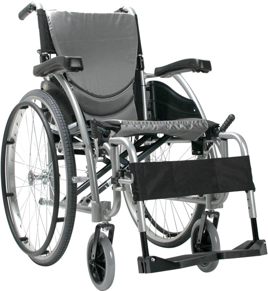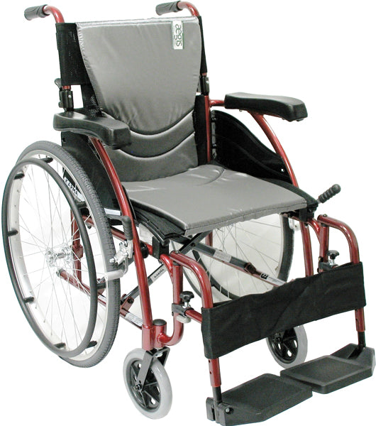 This Karman S-115 ultra lightweight wheelchair has a supportive seating system to provide pressure relief and anti-slippage giving the user excellent stability and posture support. Instead of a flat back and seat, this series of wheelchairs has ergonomic S-shape seating to conform to and support the natural body shape with seating and back comfort while helping to protect against pressure sores and backaches. This model of the Karman ergonomic series has fixed armrests and swing-away footrest.