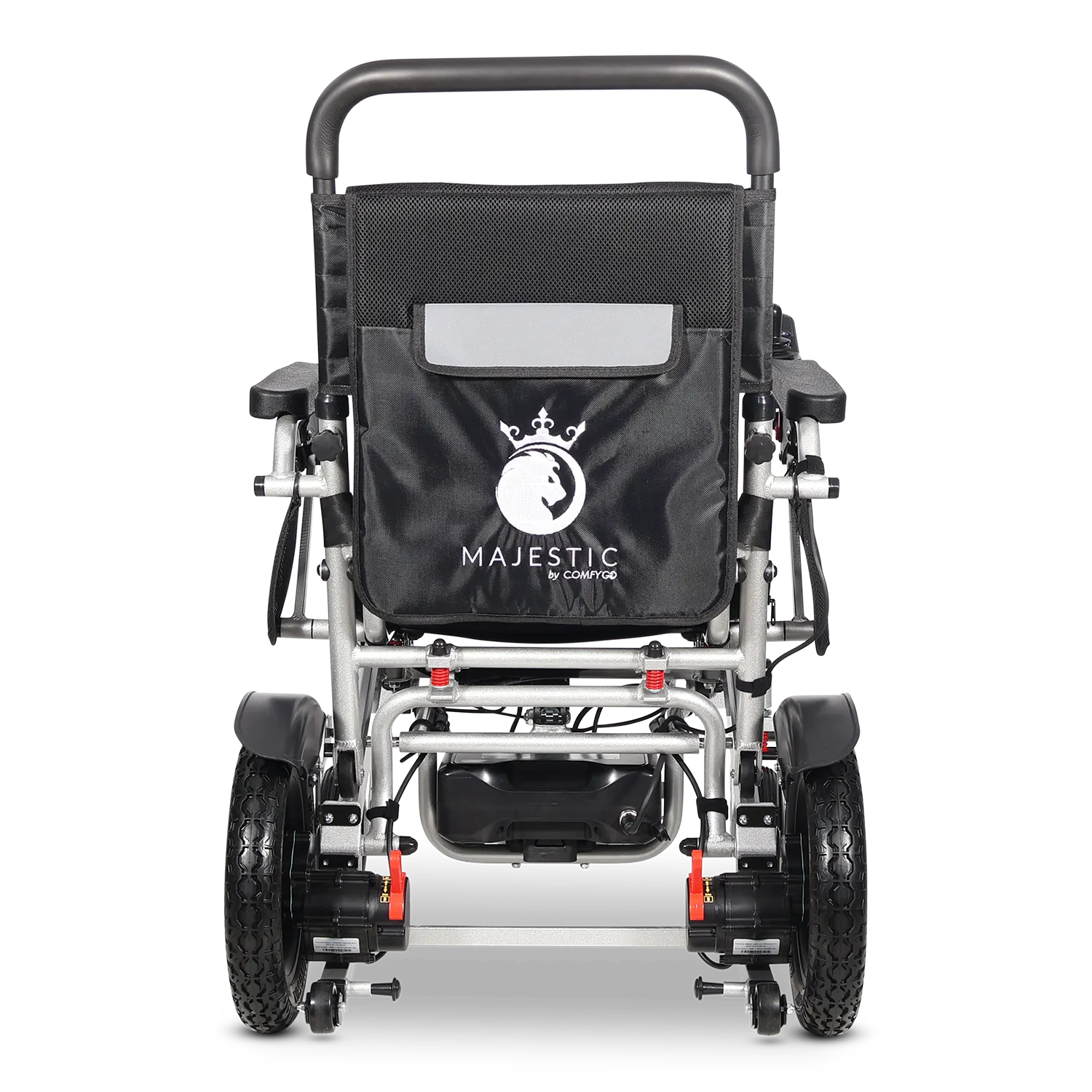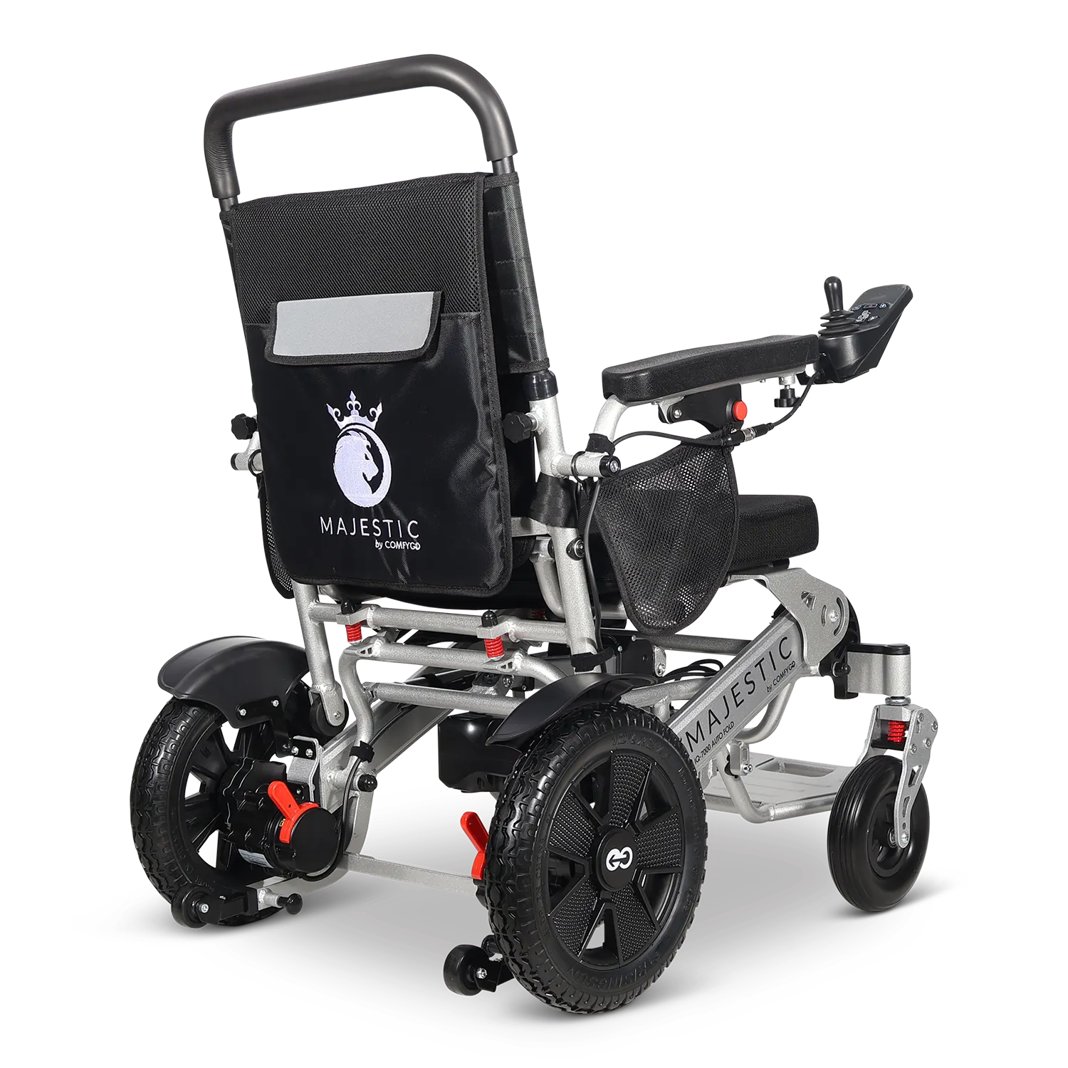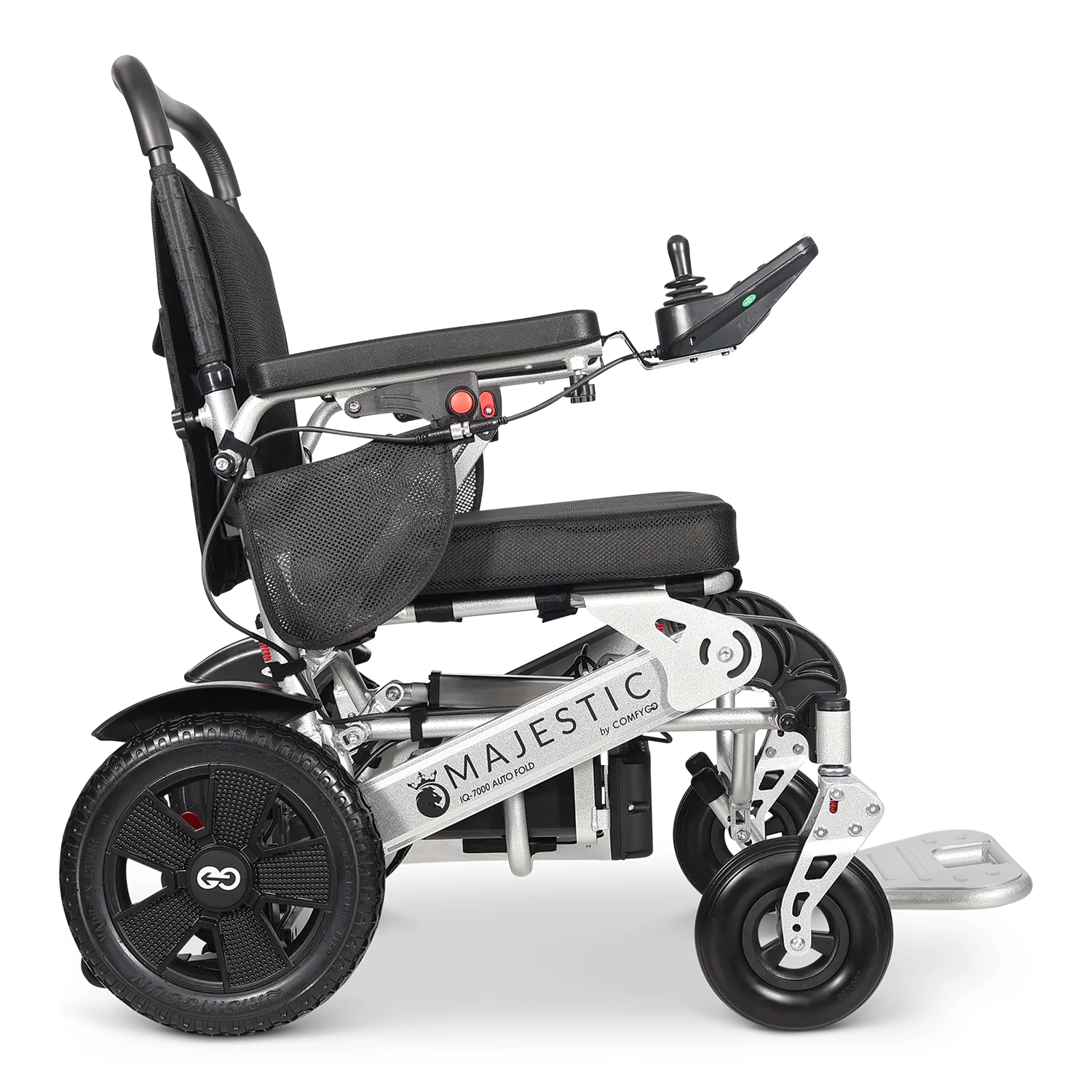 The MAJESTIC IQ-7000 AF (Auto Folding) wheelchair is a beautifully designed automatically folding electric wheelchair for travel. This transport motorized wheelchair is lightweight, airline friendly. This is a sturdy wheelchair and features a weight capacity limit of up to 350 lbs. with a top speed of 4 mph. The IQ-7000 auto folding is available in four frame colors with five optional cushion and backrest colors that allow you to fully customize the color of your wheelchair. It’s equipped with a 360-degree waterproof universal intelligent joystick for easy control. The intelligent joystick includes a power on/off button with a power indicator light, speed selection buttons, and a horn. The 12AH lithium-ion battery powers two 250W DC motors that deliver a range of up to 13 miles.