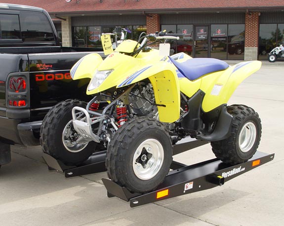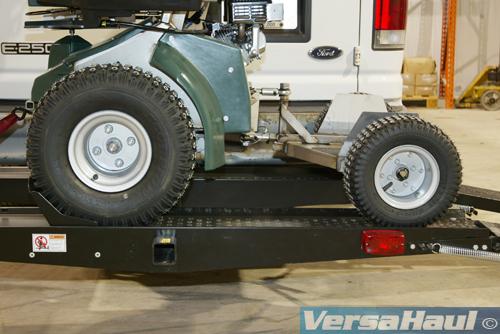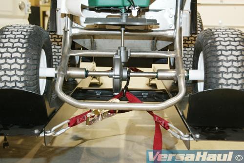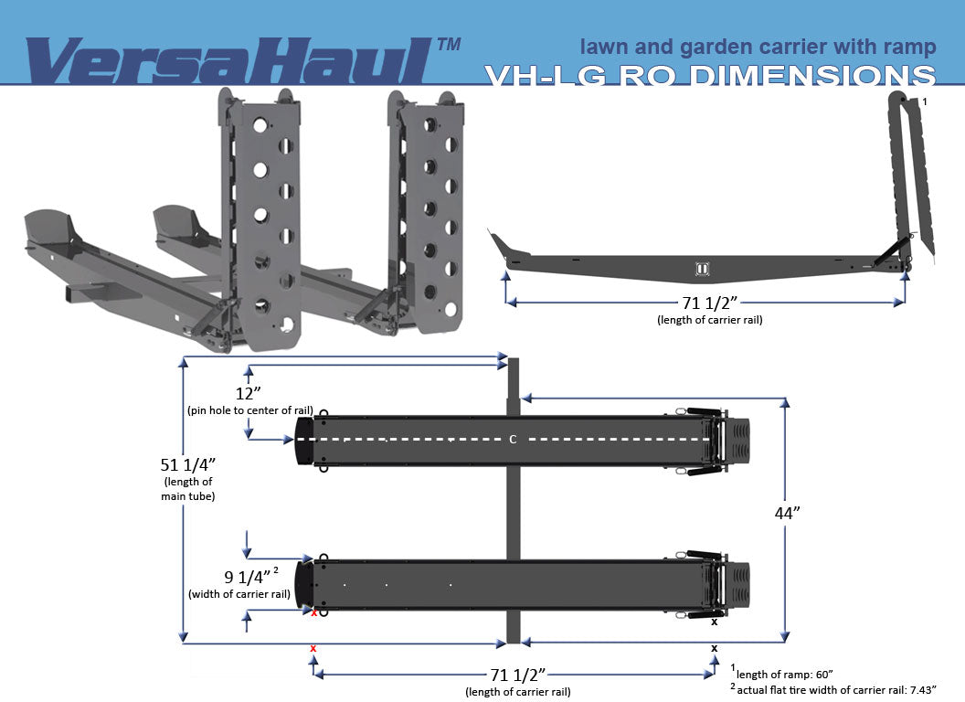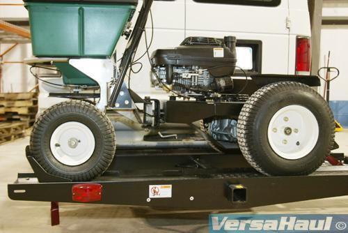VERSAHAUL model VH-LG-RO Lawn And Garden Carrier mounts to your Class III or IV, two inch hitch receiver. The carrying capacity is 700 lbs, so please check your vehicles suspension carrying capabilities and your vehicles hitch rating before loading your equipment. Two spring loaded center folding ramps help to get your equipment up and on the the carrier then fold away when not in use. The unique anti-tilt locking feature keeps the carrier from rocking back and forth while driving down the road.
