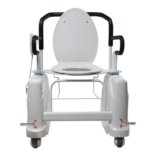 The CL1’s versatile design makes it suitable for use in homes with larger bathrooms as well, and its higher weight capacity of 350 lbs. offers additional flexibility. Equipped with lockable wheels and a sturdy, wide base, the lift can be easily rolled in and out of bathrooms, and some even use it as a bedside commode, thanks to the included commode rack and bucket. This mobile lift offers 11' of smooth, controlled lift, and features padded arms, a push handle, and foot-operated wheel locks for added stability. With a rechargeable battery, the CL1 can move freely between rooms, ensuring that mobility support is available wherever it’s needed most.