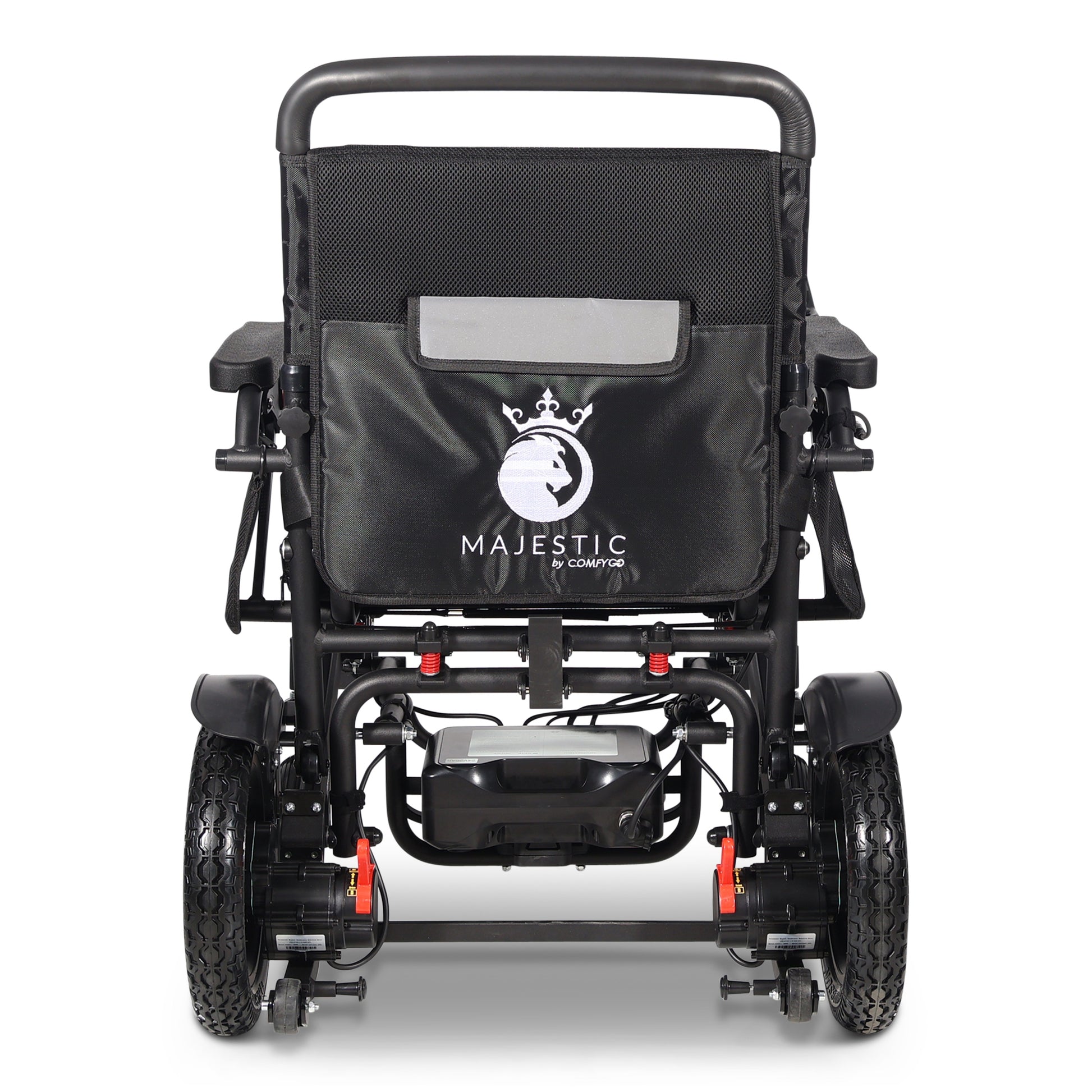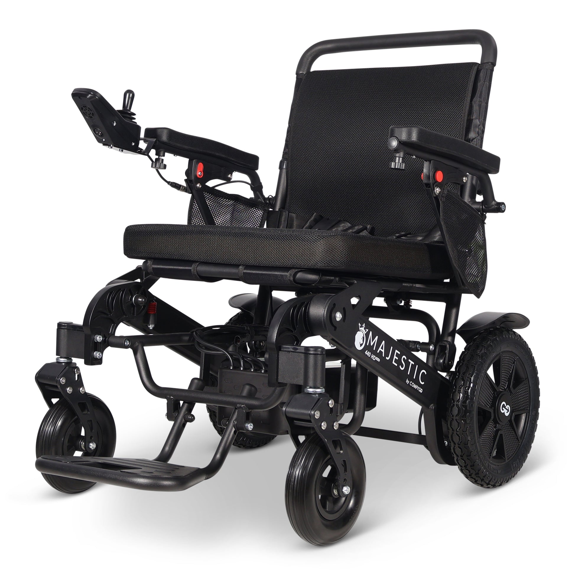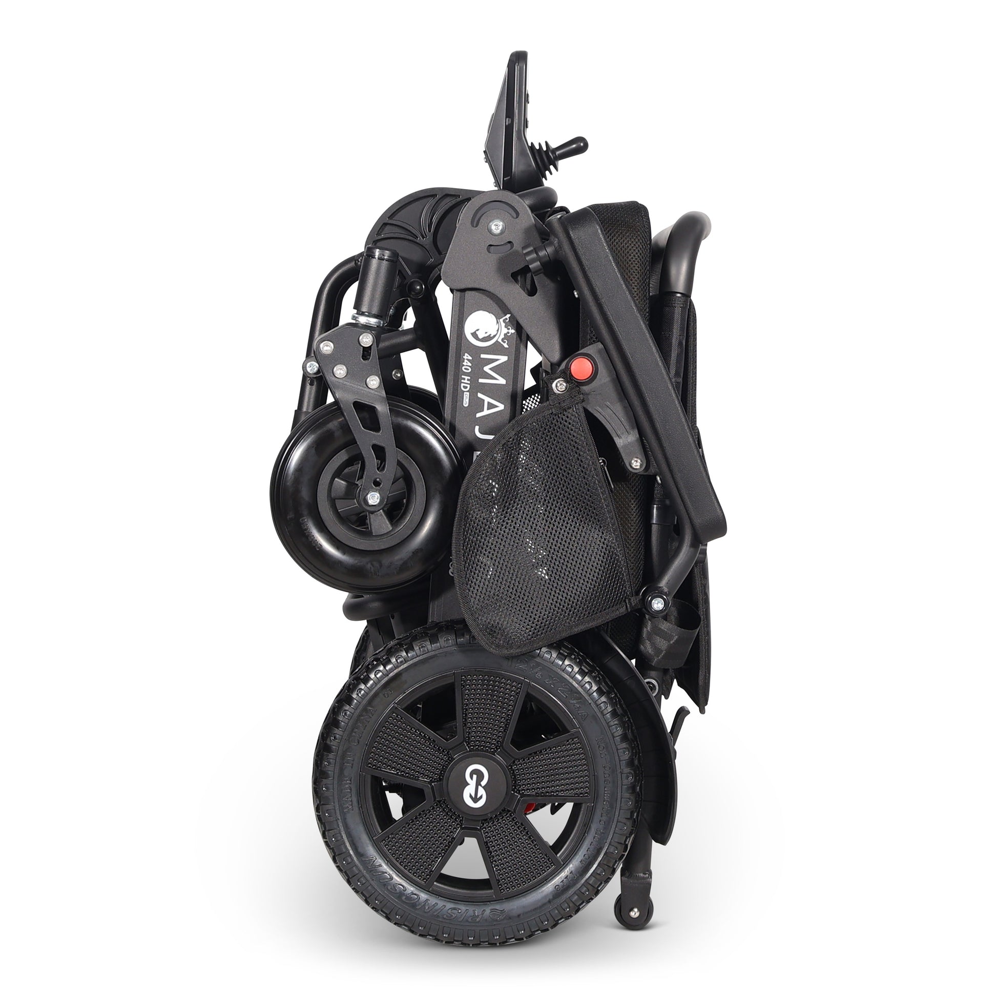 The MAJESTIC 440 HD PLUS wheelchair is a beautifully designed folding electric wheelchair for travel. This transport motorized wheelchair is lightweight, airline friendly. This is a sturdy wheelchair and features a weight capacity limit of up to 440 lbs. with a top speed of 4 mph. The 440 HD PLUS is available in four frame colors with five optional cushion and backrest colors that allow you to customize the color of your wheelchair fully. It’s equipped with a 360-degree waterproof universal intelligent joystick for easy control. The intelligent joystick includes a power on/off button with a power indicator light, speed selection buttons, and a horn. The 12AH lithium-ion battery powers two 250W brushless DC motors that deliver a range of up to 12 miles. 26AH batteries gives up to 25 miles of range