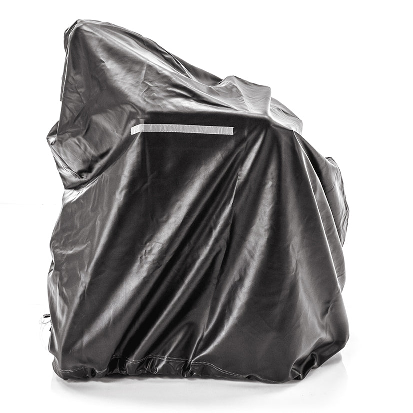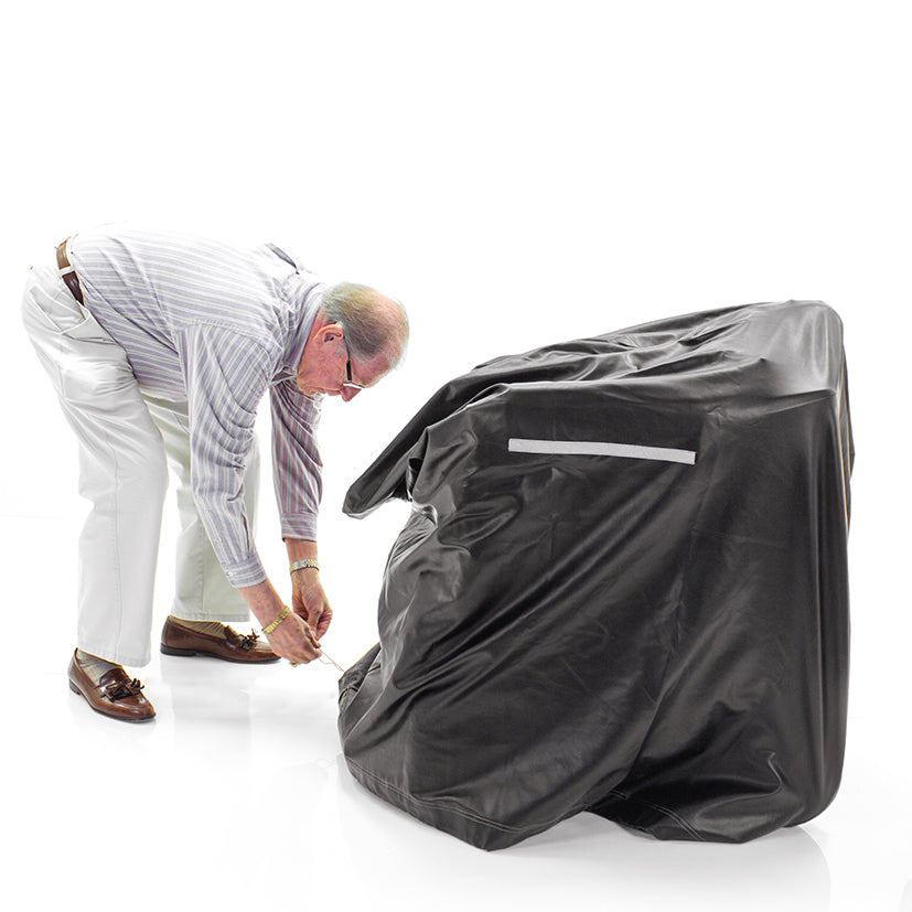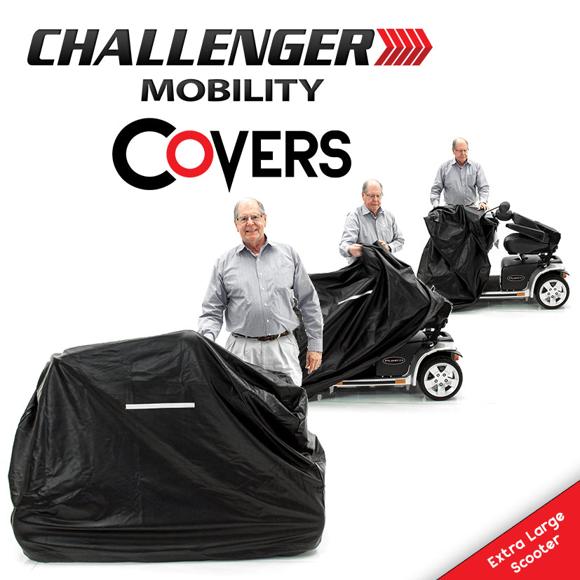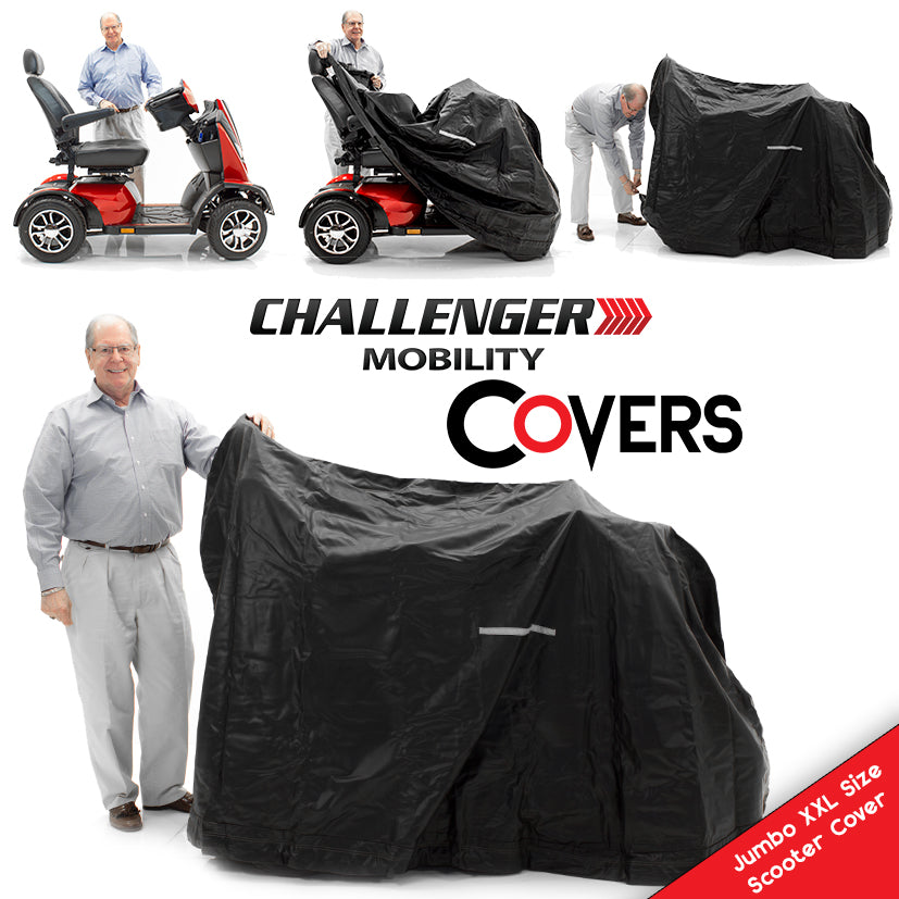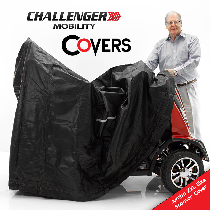 La funda Challenger Mobility Cover es la funda impermeable de vinilo ligera y de lujo más duradera de Estados Unidos para scooters, sillas de ruedas eléctricas y manuales. Esta funda de alta calidad incluye de serie una cinta reflectante de seguridad que mejora notablemente la visibilidad nocturna.