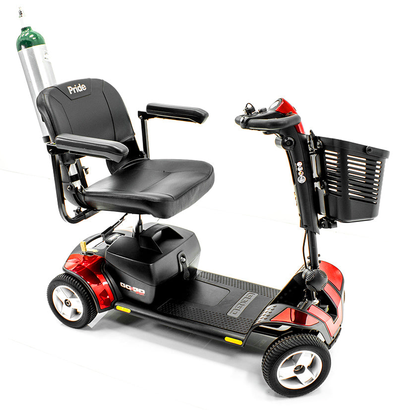 Le support de bouteille d'oxygène pour scooter Challenger Mobility vous permet d'emporter votre bouteille d'oxygène partout avec vous ! Ce support métallique se fixe facilement au support carré de votre scooter grâce à une goupille de fixation. Il est compatible avec la plupart des scooters et fauteuils roulants électriques disponibles aux États-Unis. Ce cylindre est compatible avec les bouteilles d'oxygène de tailles D et E, et son support est équipé d'un système de réglage permettant au plus petit modèle D de s'y loger solidement.
