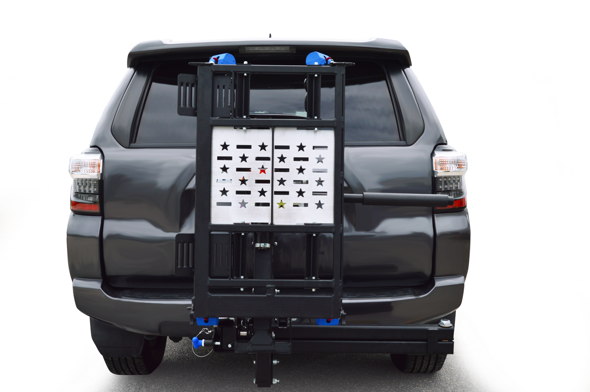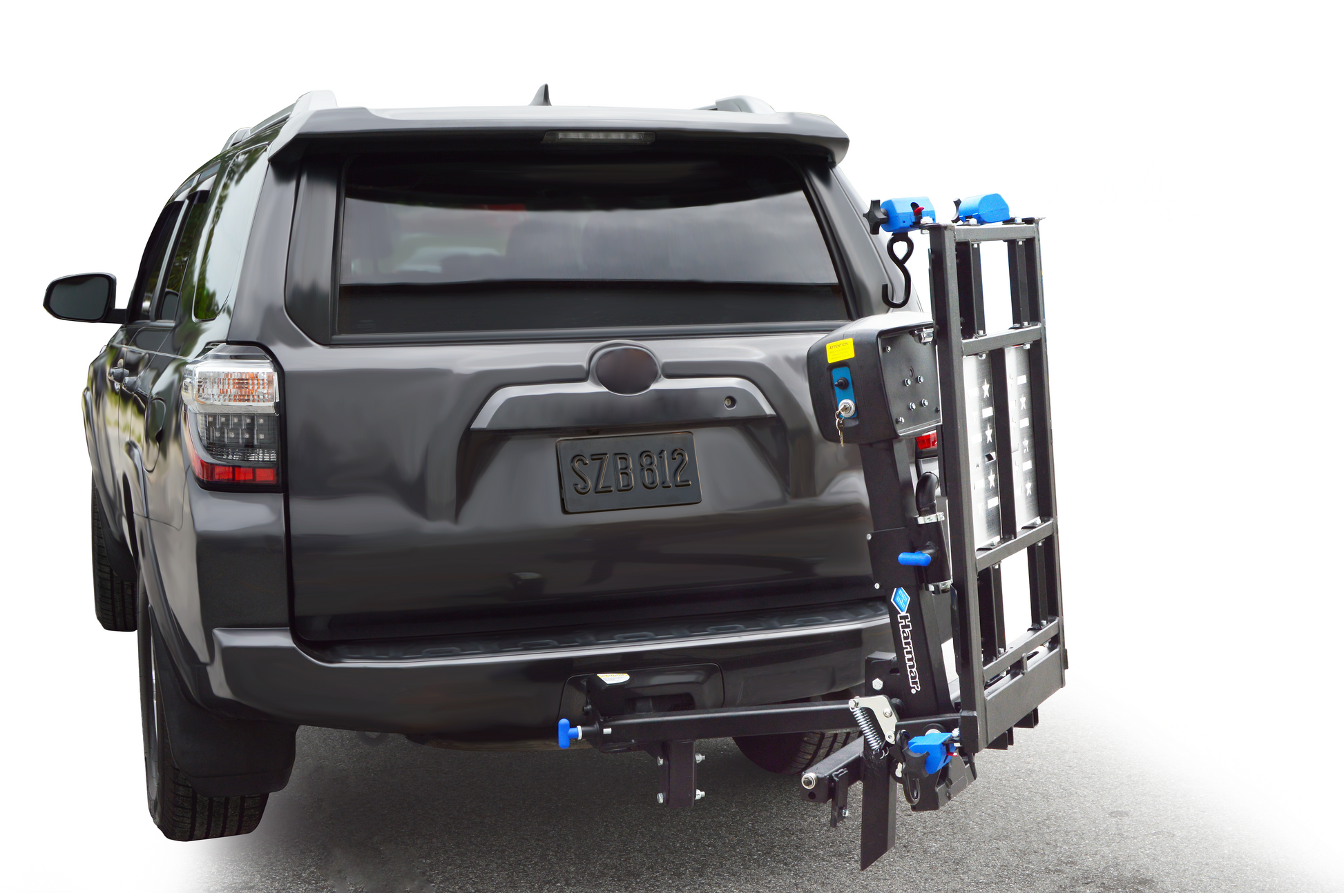 LIFTS UP TO 450 LB The AL580-HDX is designed to lift and transport heavy mid-wheel power wheelchairs with wheel sizes from 10" - 14". These mobility devices are secured with a combination of 4-Q'straint retractors and a hold-down arm. The Stars-N-Stripes platform guards against road debris and in some cases the optional swing-away maintains access to a vehicle's cargo area. The AL580-HDX is compatible with a variety of SUV's, trucks, and crossovers.